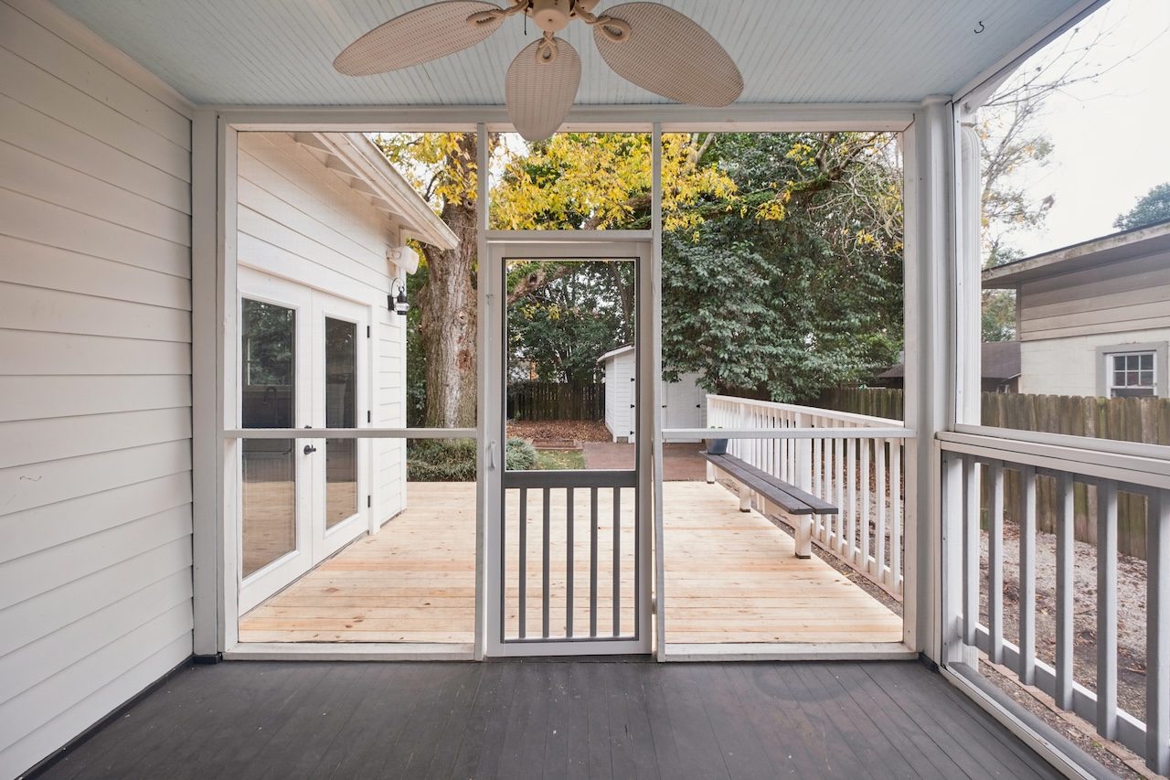 The open-concept kitchen is designed for effortless entertaining, and newly installed French doors lead to the brand-new back porch, creating a seamless connection between the kitchen and the screened porch just off the dining area. The new rear deck opens to a turfed backyardlow-maintenance and perfect for pets or playalong with a fabulous storage shed brimming with potential for additional storage, a workshop, or even a creative entertaining space. The fully fenced yard features a mature pecan tree, a spacious brick patio, and plenty of room to gather. Upstairs, you’ll find three bedrooms and two full baths. Each bedroom features newly installed custom closets to maximize storage. The primary suite includes an en-suite bath with a walk-in shower and vanity.